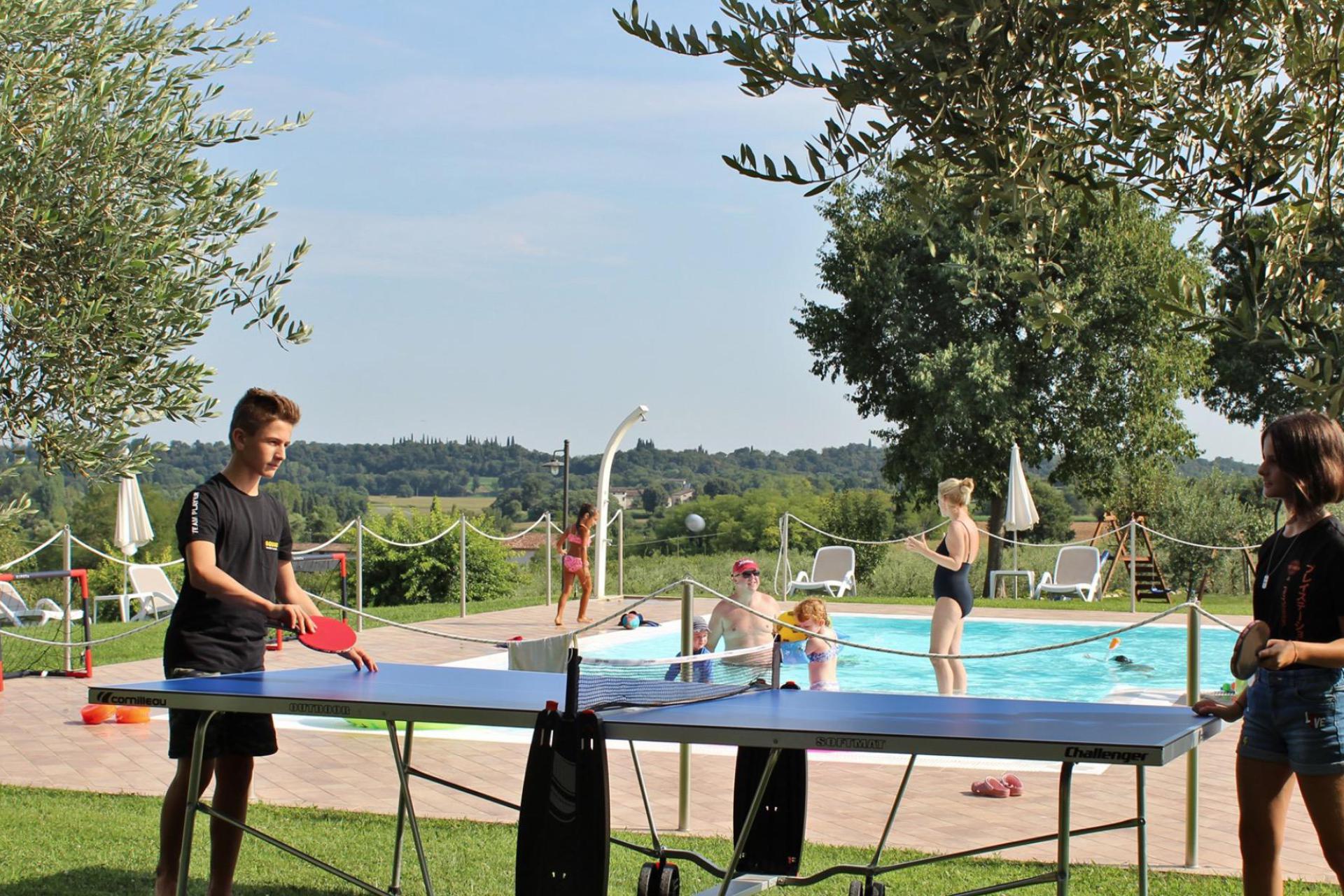 Das Schwimmbad ist vom 1.Mai bis 30.September geöffnet. Es liegt wunderschön in dem Olivenhain. Für Kinder gibt es einen flacheren Bereich im Becken. Sonnenliegen und Sonnenschirme stehen den Gästen zur Verfügung. Eine große Rasenfläche können Kinder zum Springen, Toben und Fußball spielen nutzen. Ein Barbecue-Bereich steht den Gästen zur gemeinsamen Nutzung zur Verfügung und auf der großen Gemeinschaftsterrasse mit Sonnenschirmen ausgestattet, hat jede Wohnung seinen eigenen Tisch mit Stühlen.