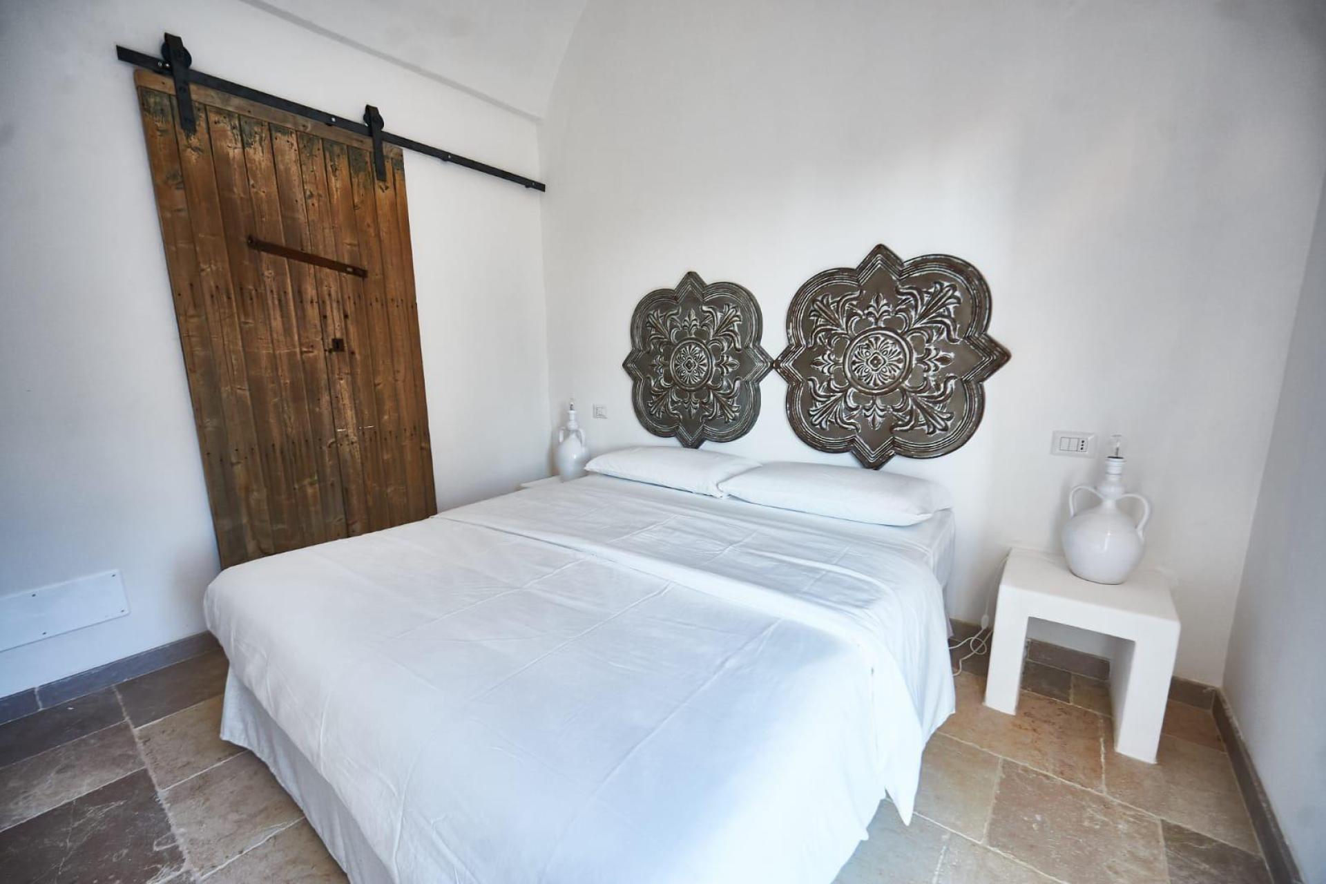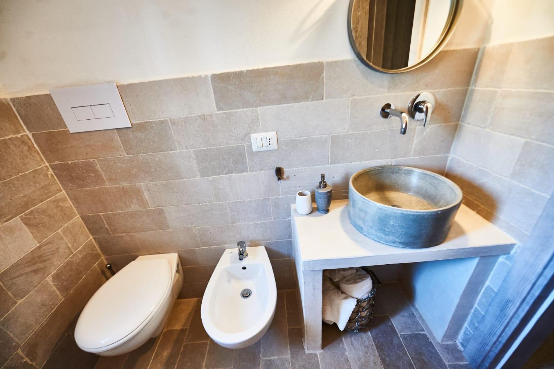 Das erste Gebäude ist der restaurierte Trullo – ein traditionelles Steinhaus mit dem typisch kegelförmigen Dach. Hier befinden sich ein Doppelzimmer und ein Bad mit Dusche.